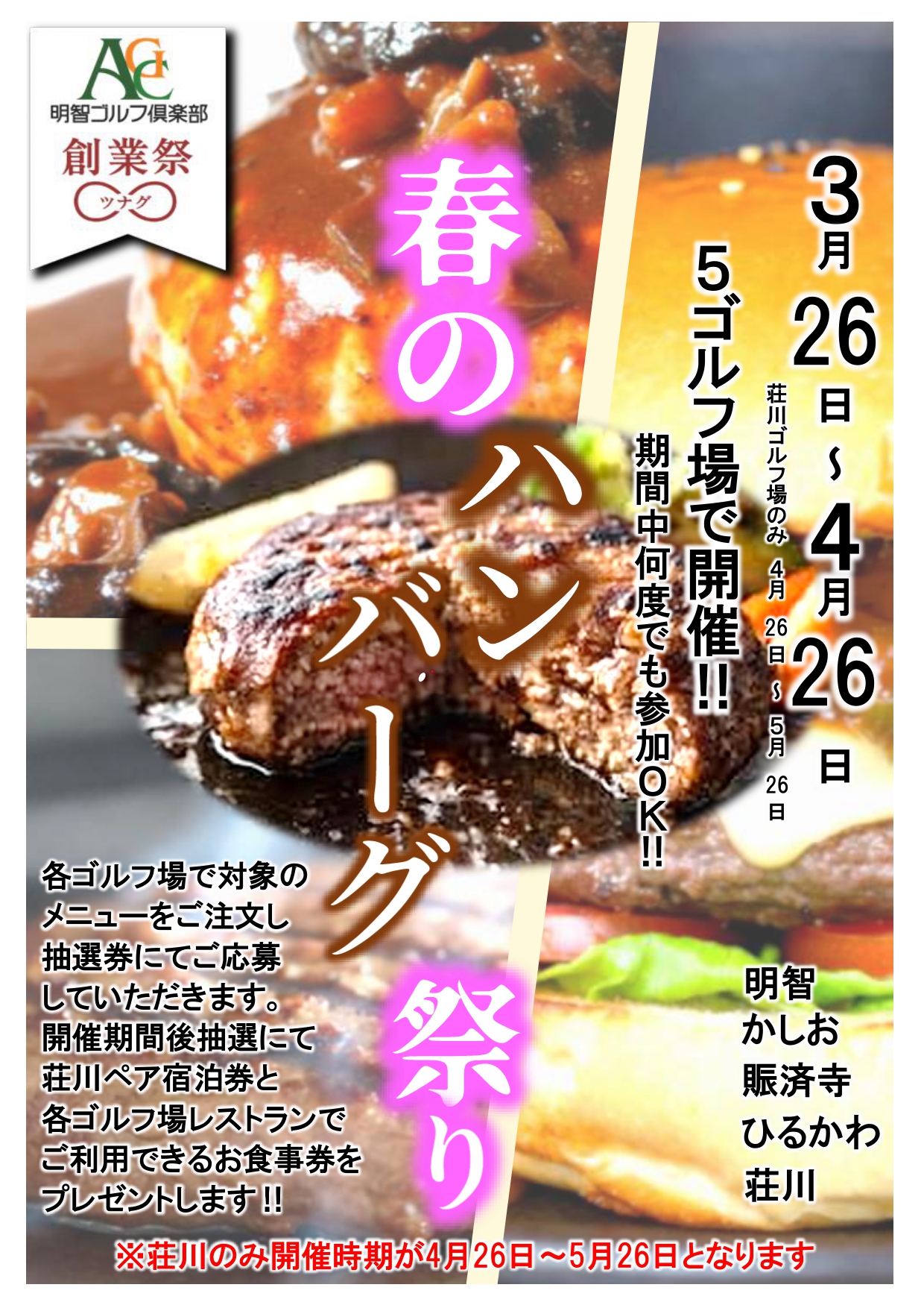 - ハンバーグ祭り4/26迄開催中! ハンバーグ膳お召し上がりのお客様に、抽選で食事券や荘川宿泊券が当たります。