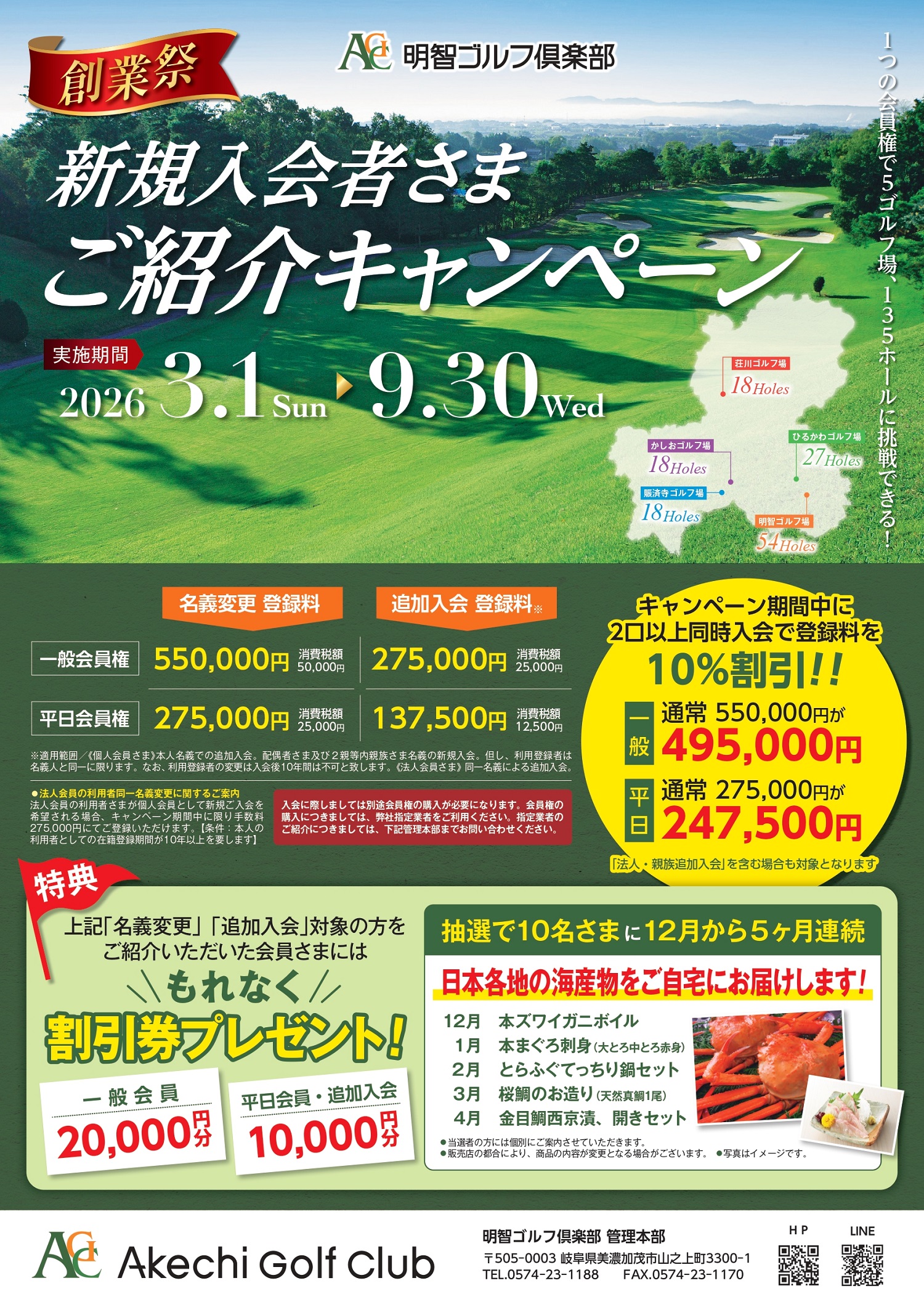 創業祭~ツナグ~ 新規入会者さま「ご紹介キャンペーン」 2026.02.28 明智ゴルフ倶楽部「創業祭 ~ツナグ~」 新規入会者さま ご紹介キャンペーン開催のお知らせ 明智ゴルフ倶楽部では、「創業祭 ~ツナグ~」の一環として 新規入会者さま ご紹介キャンペーンを開催いたします。 ■ 開催期間 2026年3月1日(日)~9月30日(水) 1つの会員権で5ゴルフ場・全135ホールに挑戦いただけます。 詳細につきましては、ポスター下部の電話番号までお気軽にお問い合わせください。