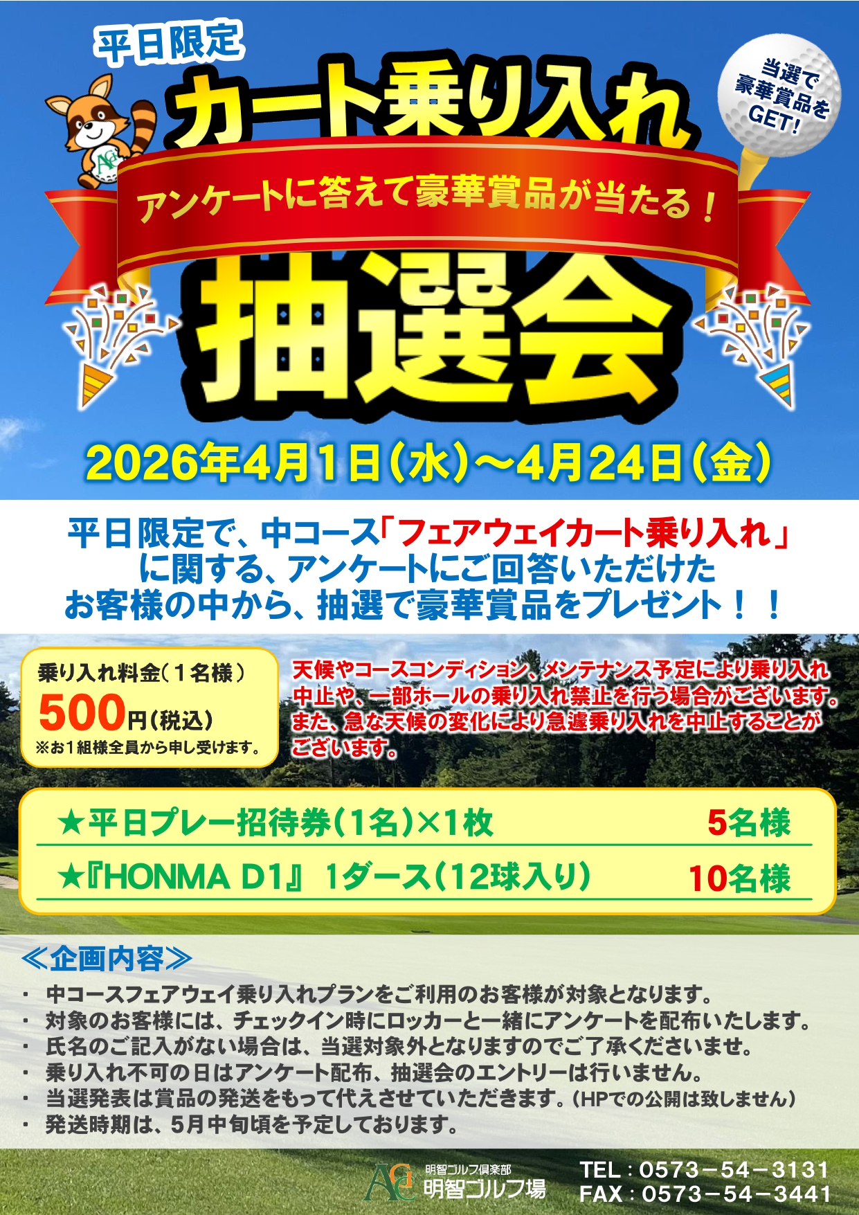 4月以降はフェアウェイカート乗り入れのため、乗り入れ料金500円を別途申し受けます。