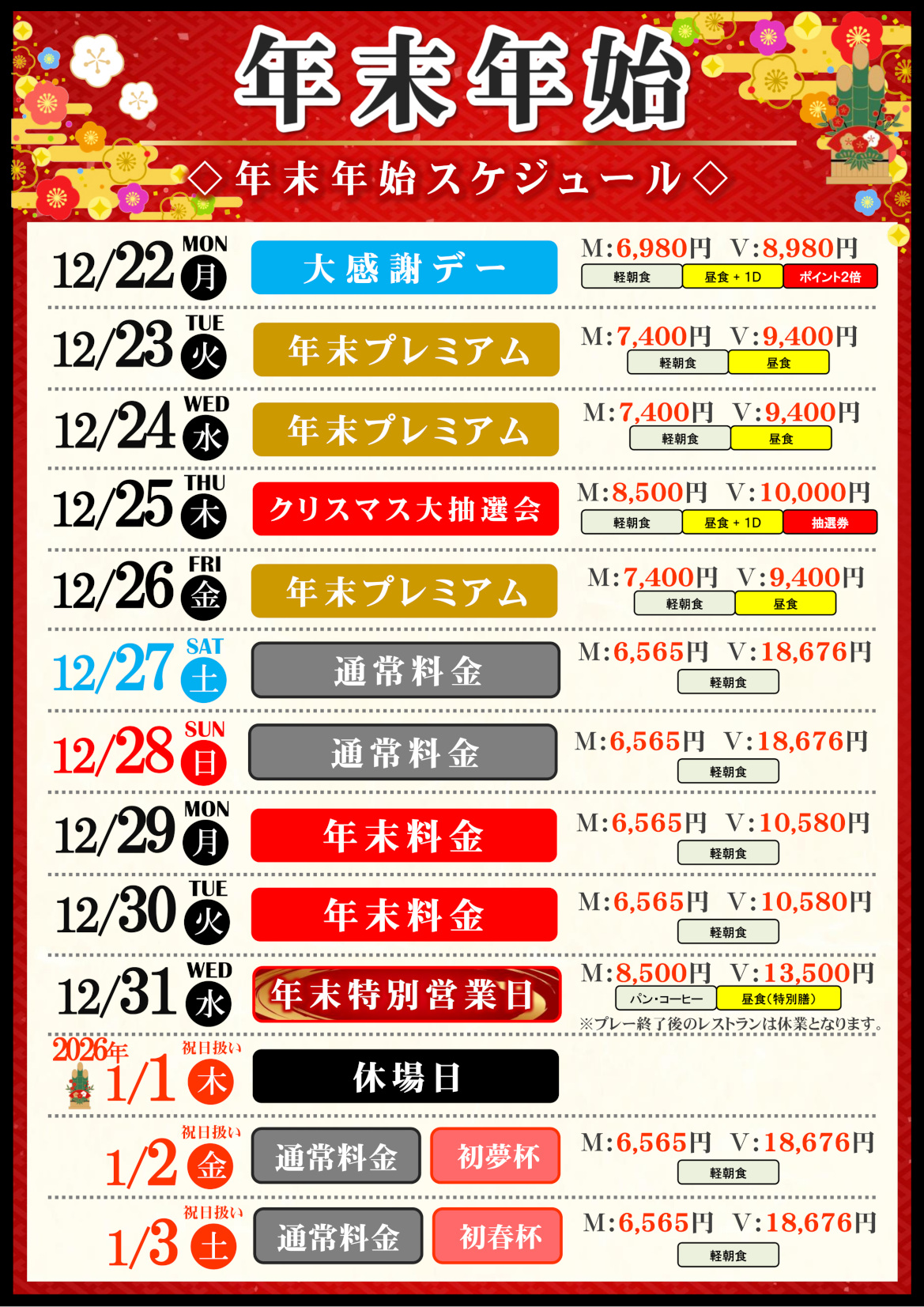 日頃よりご愛顧いただき、誠にありがとうございます。 年末年始の営業スケジュールおよびプラン内容につきまして、下記の通りご案内申し上げます。