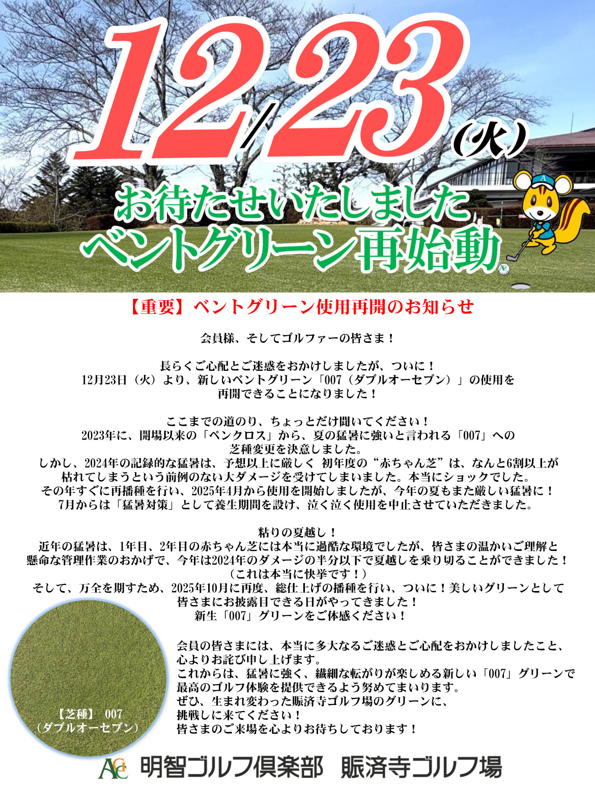 2025年12月23日(火)よりベントグリーンの使用を再開します。