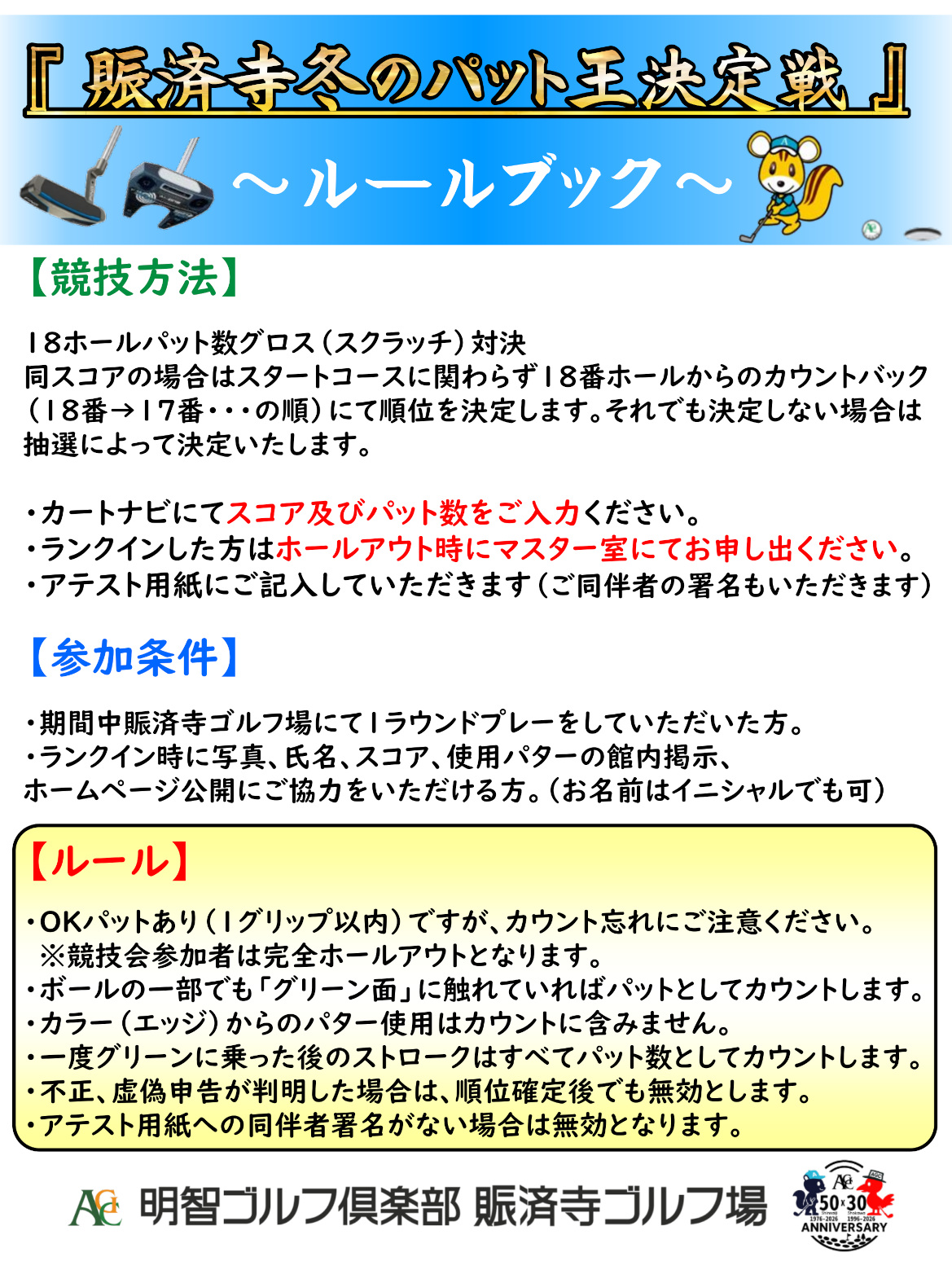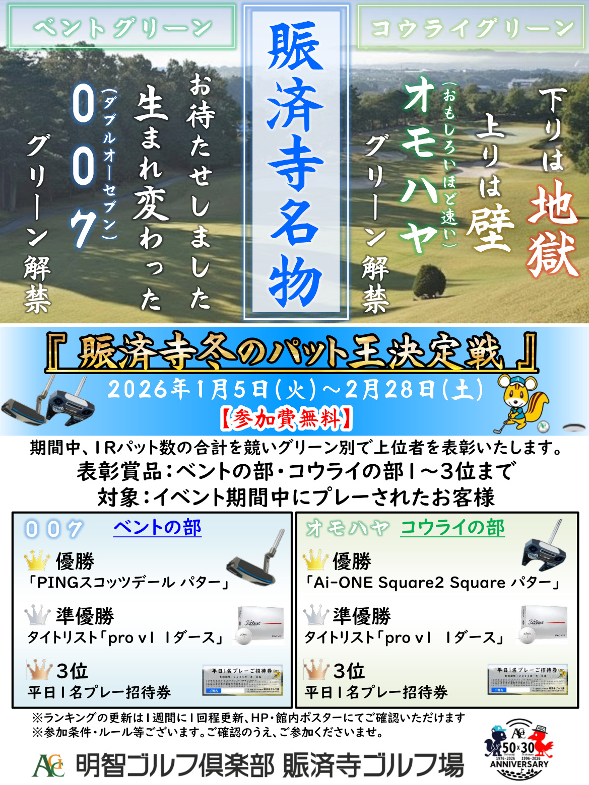 賑済寺冬のパット王決定戦 イベント詳細 日付: 2026.01.05 09:00 – 02.28 10:00 カテゴリ: 賑済寺ゴルフ場 『賑済寺冬のパット王決定戦』 2026.1.5(月)〜2.28(土) 上記期間中、1Rパット数の合計を競いグリーン別で上位を表彰いたします。 皆様のご参加お待ちしております。