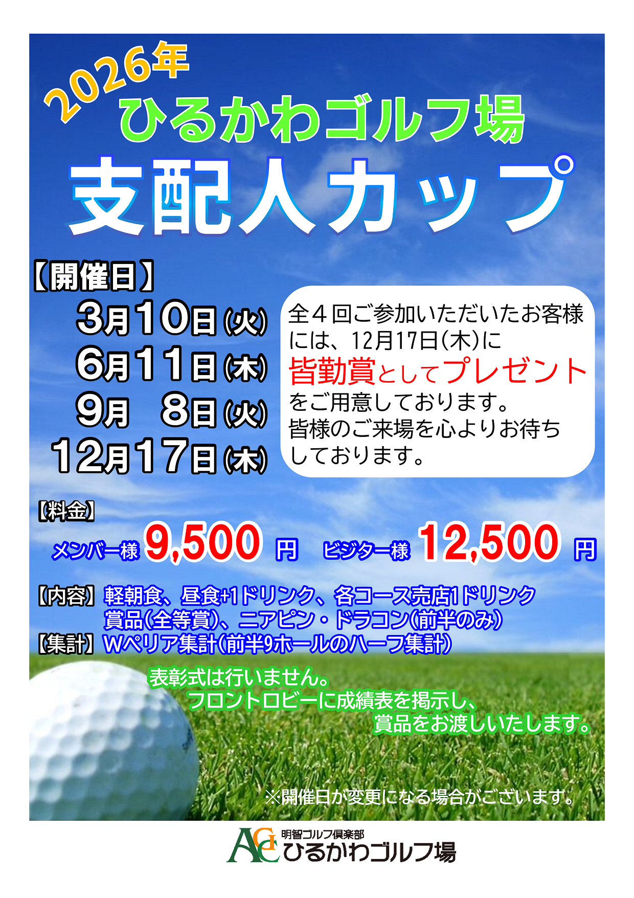 2026ひるかわ支配人カップ イベント詳細 日付: 2026.03.10 – 12.17 カテゴリ: ひるかわゴルフ場 全4回ご参加いただいた方に皆勤賞をご用意!! 是非皆様のご参加をお待ちしております。