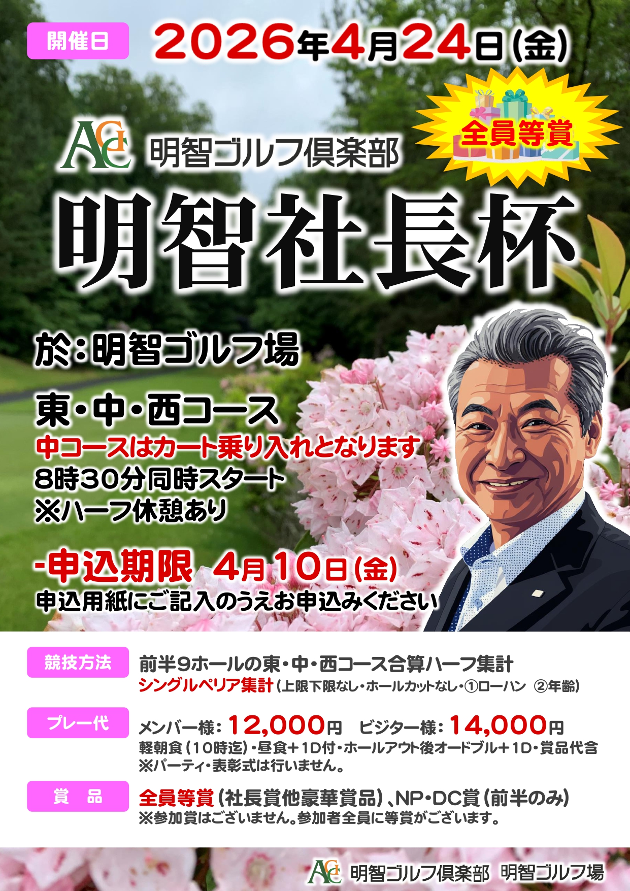 2026年『明智社長杯』 イベント詳細 日付: 2026.01.28 14:00 – 15:00 カテゴリ: 明智ゴルフ場 ★明智社長杯★ 〇開催日:2026年4月24日(金) 〇会場:明智ゴルフ場 東・中・西コース 8時30分同時スタート ※ハーフ休憩あり 賞品全員等賞!社長賞他豪華賞品も取り揃えておりますので、 お誘い合わせのうえご参加お待ちしております。 ★明智社長杯★ 組合せはこちらから ※組合せ公開までもうしばらくお待ちくださいませ。